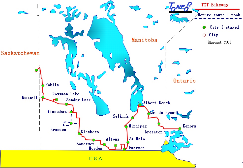 TCT Bikeway 60km from Morden: On the TCT route, there are guideposts like this. But sometimes post ilies in a grass, and I have to run around looking for it. |